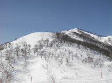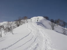 五竜のスキー場から登ることわずか約40分で一ノ背髪。そして約1000mの滑りが楽しめる。なんと効率の良い、お気軽なルートなんだろう・・・。でも・・・山に登ったという気がしない。スキーは楽しめるものの、終わってからの満腹感はなし。このルートはいわゆる“バックカントリースキー”というヤツで、“山スキー”とはちょっと違うような・・・。山スキーとバックカントリースキーの正確な定義はわからないが、イメージ的には・・・。まあ、時間がない時や疲れている時なんかには都合の良いルートだ。