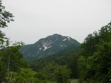 梅雨の晴れ間の最終日、天気はスカッとはしないが、悪くもない。雲は出ているが高く、霞みながらも山は全て見えていた。湯峠の登山口の駐車場には車がいっぱい。大渚山を往復してくる間誰にも会わなかったので、この車は全部山菜取りだったのでは。吹き溜まりっぽいところには、まだけっこう雪が残っていた。