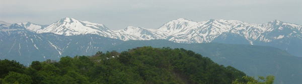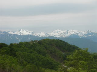 西端の山頂なので、展望台からは谷越しに北アルプスを見ることができた。雪倉岳や朝日岳にはたっぷり残雪があり、まだ上から下までしっかり雪がつながっていた。白馬岳より南になると、雪の量はぐっと減る。雨飾山もいつもの姿を見せているが、雪をまとった雨飾山のほうが断然カッコイイ。
