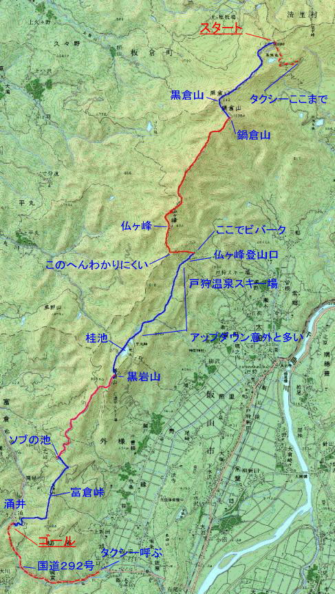 さて、車は関田峠。とりあえず街に下りなくてはならない。近くにバス停はあるが、こんなところ上手い具合にバスが来るとは思えない。近くのバス停は戻る方向になるので、遠いが町のほうのバス停に向かって国道を歩き始めた。アスファルト道を歩くには長靴は辛い。底が薄いので、足が痛くなってきた。歩けど歩けどバス停はない。そのうち民家が出てきて、ちょうど外におばさんがいた。おばさんにタクシーのTELを聞き、ここから電話。今日の歩きはここで終了。・・・のはずだった。