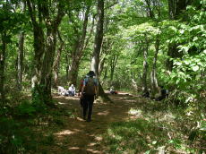 登山口は標高約900m。気持ちの良い広葉樹林で始まる。ミズナラやブナが中心で、ちょうど新緑の良い季節だ。道はほぼ緩い登りだけど、時々下ったり急になったりで変化がある。しかし尾根道なのにずっと樹林に覆われていて、展望がほとんどない。たま〜に木々の間から雪の残った白山(たぶん、別山あたりか・・・?)が見えるくらいだった。一服平で一服。