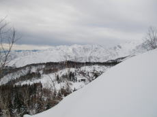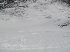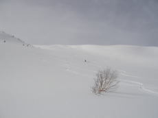 天狗原に着くも、なんせ空が鉛色。写真栄えしないなあ・・・。今日の写真は全て白黒写真かと思えるようなヤツばっかりだった。ハクノリの大斜面を先行者が2名登っている。恐らく先行者はこのお二人のみだ。今日なんかはアリの行列かと思っていたのに・・・。大斜面に取付くと、なかなかのパウダー。かなり風でパックされ、片栗粉のような感じだが、それほど重ったるくはなさそうだ。これなら快感を得られるかも!先行者が滑ってきた。まあまあ気持ち良さそうだ。