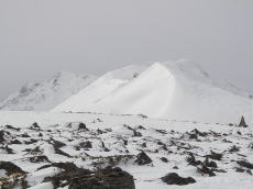 直下に板を置いて、せっかくなので景色を見に行く。ハクノリの山頂は雪が多くても少なくても、いつもと変わらない岩ゴロゴロの山頂だ。ここから船越の頭に続くカミソリのような雪稜、いつ見てもきれいだなあと思う。雪倉と朝日も並んで座っているが、日が当たらず目立たない。でも、両方とも山全体が真っ白!厳冬期の雪倉なんて行ってみたいが、普通の休みでは日数が足りないな。
