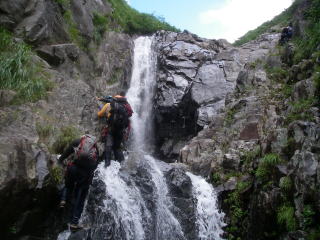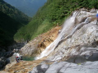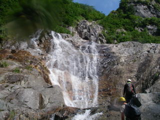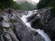 前日の昼間に出発し、登山口近くで前夜祭。盛り上がったけど、宴会はやっぱり沢の中に限る。テントの中で焼肉は暑すぎた。前夜祭は雨降りだったが、朝起きたら晴れ!いつも大混雑の駐車場はスカスカ。台風がみんなの予定を狂わせてしまったのかもしれない。堰堤工事用の作業道を進むが、行き過ぎて少し戻った。そうそう、きのうは話に夢中でインターを通り過ぎてしまったし、登山口への道も通り過ぎてしまったし・・・。ボケ気味だ。 暑い暑い作業道歩きから米子沢に入る。しかし、米子沢下部の広いゴーロは伏流している。早く水に浸りたい!谷が狭まってやっと最初の滝となる。せっかくきれいな滝なのに、まだ朝日は当たらない。南西に面している米子沢は、朝日が当たるのが遅いのだ。それを考えると、もっと遅く出発するのも手だが、遠いだけに下山が遅くなるのは困る・・・。