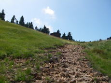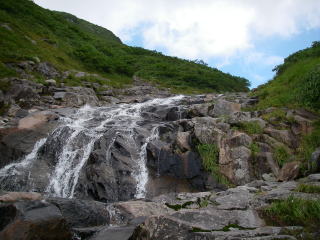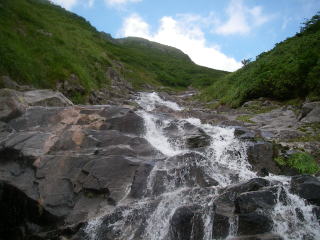 ナメナメ天国が一段落すると、源頭の雰囲気に。雰囲気は源頭だが、水量はまだまだ豊富。左からの支流をいくつか分けると、さすがに水量は減り、草原の中を流れる小川となった。終了点は避難小屋へと続く窪。さて、昨日から通り過ぎる癖がついてしまっているが、最後の詰めだけは通り過ぎないようにしなければ・・・。しっかり意識していたので、ここは大丈夫だった。ここで沢装備解除。5分で避難小屋へ。