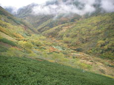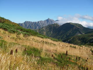 三俣蓮華岳から黒部五郎小舎の間は、主にハイマツの稜線。ハイマツのみでは、さすがに秋は感じられない。夏と同じ。ところどころにチングルマのお花畑があって、そこに来ると瞬間的に秋になる。黒部五郎岳のパックリ開いたカールが正面に見える。ここから見る限りでは、色づきは今ひとつか・・・?でも、夏でも楽園のような場所なので、きっと秋の今は超楽園に違いない!草原のコルに経つ黒部五郎小舎は、風情たっぷりだ。すでに小屋閉め後であった。どうりで人が少ないと思った。