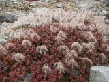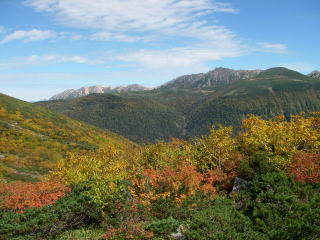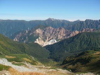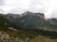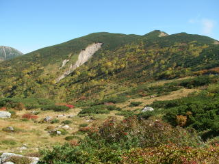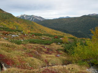 この双六〜三俣の巻き道は、ほぼ森林限界上にある。なので、派手に染まるナナカマドやダケカンバなどの潅木は、ところどころにあるくらい。主体はお花畑なのだが、チングルマやツツジ(?)系の葉っぱが紅葉し、地味だけどなんとも言えない味のある秋を感じさせてくれる。これが点在する白い巨岩やカール壁と絶妙にマッチするんだわ。ナナカマドの華やかな紅葉も好きだけど、こっちの地味な紅葉も好きだ。