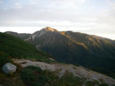 今日は双六にテントは張りっぱなしで黒部五郎岳往復なので、準備は楽チン。ピストンってことで芸がないかもしれないが、双六〜三俣は行きを巻き道、帰りは尾根コースを歩き、黒部五郎小舎〜黒部五郎岳も行きはカール、帰りは尾根道を下る。重なる部分は三俣蓮華岳と黒部五郎小舎の間だけなので、かなり楽しめるのではないかなあ・・・。まずは朝日の当たる三俣への巻き道に期待!