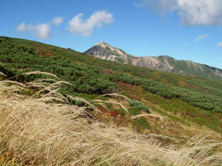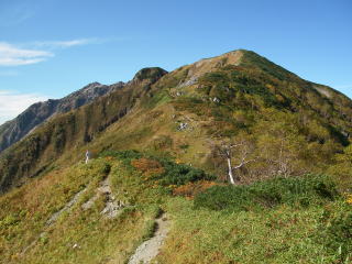 大ノマ乗越から大ノマ岳への登り。標高差のある苦しい登りだが、ここは予期せぬ見所だった。何が良いかといわれると困るが、なんとなく良かった・・・。大ノマ岳の南側の狭いピークには、なぜかたくさん人が集まっていた。本峰よりも低いはずだけど、尖がったピークに登りたがるのは山ヤの習性か?