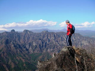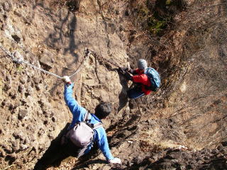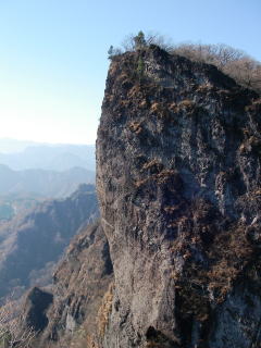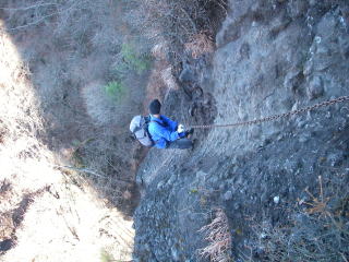感じとしては戸隠に似てるなあ・・・。主稜線に登るまでが岩場の連続で厳しく、縦走になるとガッカリするような普通の道。戸隠は本当にガッカリしてしまった覚えがある。それに比べて妙義の方は、普通の道も多いけど、鎖がないと登ったり降りたりできない、手強い岩場が随所に出てくる。また、スッパリ切れ落ちた東側の高度感は戸隠をはるかに凌ぐ。浅間のある西側の展望も良いし。すでに葉っぱが落ちているのも好条件。夏は死ぬな・・・。