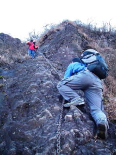 脅しのような看板を過ぎると、いよいよ本日の核心部、鷹返し(鷹戻し?)。離れたところから見てると、どっから登るの・・・?というような尖がりよう。実際に垂直に近い岩場の連続だった。ま、一般道ということで、鎖は完備。ただ、普通の一般道だったら、鎖は補助的に使うことになるが、ここは鎖に全面的につかまることが前提。登山者が多いんだろう、岩の出っ張りは丸く磨かれて滑りやすい。鎖がなかったら、相当に手強いクライミングになりそう。下りは当然懸垂以外は不可能・・・。