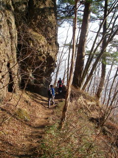 それにしても天狗岩だか天狗岳だかなんだかわからないが(ビジターのため)、東側がスッパリ切れ落ちていて、すごい景観だ。天狗岩で30分の中休止。日当たりが良くてポカポカ!いつまででも休憩していられる陽気だ。ところが日陰側に入ると、空気がキーンと冷えている。日当たりの悪い場所には、いつ降った雪だかわからないが、申し訳程度に雪が残っていた。
