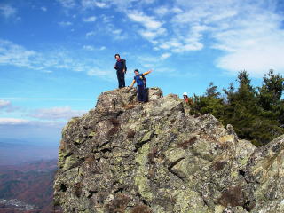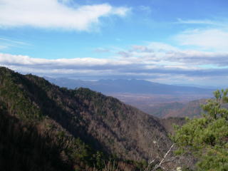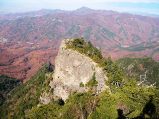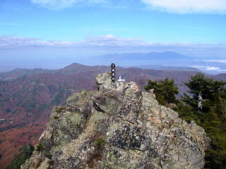 ここからわずかで山頂となるわけだが、様相が一変!北側は深い針葉樹でもっさかったのに、南側は切り立った岩場。展望良好!明るさ3倍増!思わず「わぁ〜」と声が出てしまうくらい。ガスガスの北アルプスの稜線を歩いてて、スパッとガスが晴れた時に匹敵するインパクト。これはちょっと大げさかも・・・。お預けくらいっぱなしで、最後にご褒美をもらったような感じだった。このドラマチックな山頂への出方は、瑞牆山に似てるなあ・・・なんて話もしていた。