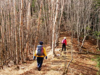 ダラダラと傾斜のない尾根道がほとんどなので、時々出てくる急坂はこたえる。ひと登りで見晴台。ま、初めて展望が開けるってことで「見晴台」か。八ヶ岳方面は雲が多め。北の方ほど雲が少ないようで、雪をかぶった北アルプスが見えた。御座山は人気があるとのことだったけど、ここまで人の気配なし・・・。