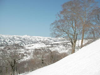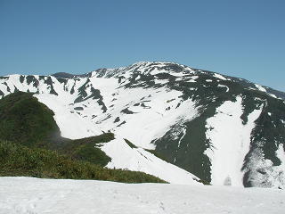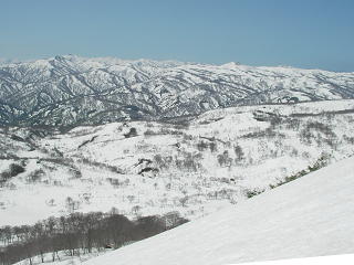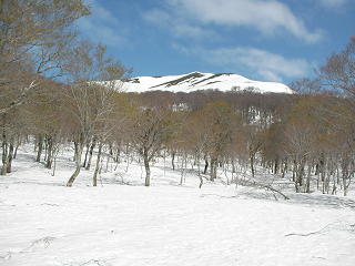 ほとんどの人が石跳川沿いに登って行く。けど、ボクたちはいきなり川を渡って、ウネウネした台地を突っ切って湯殿山へと向かった。多少ロスはあるかもしれないが、こっちの方がマッタリ感があって好きなのだ。斜度がきつくなって、自然と石跳川とのルートに合流。合流する前のブナ林は最高!ブス沼あたりだ。ここは真冬に滑ってみたいところ。きっと素晴らしいと思う。アプローチも悪くなさそうだし。尾根らしくなると木がなくなり、あとは山頂へ一直線。先客の団体さんと、あとから2人組が登ってきた。意外と空いているなあ・・・。
