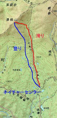 まず団体さんが東面にドロップ。すごい上手い人がいたり、ちょっと・・・って感じの人がいたりで面白かった。団体さんが滑り終わって、ボクたちの番。この斜面、標高差は400m弱と小ぶりだが、下までの平均斜度は30度くらいあり、部分的にはグッと急になる。コンパクトながら滑り応えのある斜面なのだ。石跳川に降りて休憩。このあと南東に派生する尾根に登り返し、南面のブナ林を滑ろうかとも考えていたが、もういいや・・・。シュプールに導かれ、川沿いをネイチャーセンターに戻ったのでした。