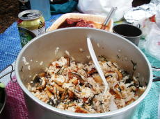 山頂は誰もいない。山頂の看板前の広場で店を広げる。もともとの目的でもある今日の昼飯。各自が思い思いに豪華ランチを持ち寄った。ジンギスカン、カルビの焼き肉、モルモン、挙句の果てにはひつまぶしまで。山で太ってしまう典型的な事例である。もう食えねえ・・・。宴もたけなわとなった頃、突然雨が降り出してきた。やれやれ・・・。ほぼ食った後だったのが、不幸中の幸いだった。