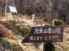茂来山には2つの登山道が紹介されている。槇沢コースはコースタイムが短いし、途中から尾根歩きになるので、槇沢コースで登ることにした。8時過ぎに歩き始めるが、西側の谷間なので日が差さない。すでにカラマツの葉っぱも落ちてしまい、冬枯れ本番だ。ただでさえあまり踏まれてない道なのに、さらに落ち葉が積もって歩きにくい。この時期はしょーがない。はじめは沢沿いの緩い道だが、コルの手前で急坂になる。尾根に出ると強風。落ち葉が下から吹き上げてくる。尾根道になっても踏み跡程度の道。そのぶん目印がたくさん付けられているようだった。