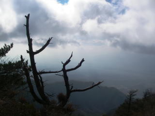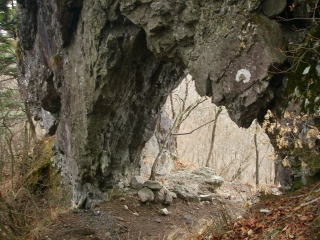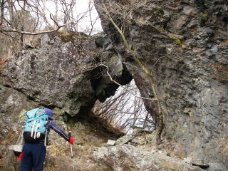 ガーッと下って少し登ると岩のトンネルがあった。ガイドマップには「石門」とあった。下ほど細くなっていて、しかも脆そうだったので、そのうち壊れてしまうでしょうね。この岩の上に開けた場所があったが、相変わらず雲が多くて展望なし・・・。ガーッと登って金ヶ岳の南峰。そして、少し下って登ったら、本峰である北峰へ。