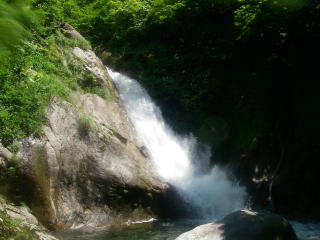 | 内ノ倉ダム(7:10)⇒七滝沢出合(8:00〜15)⇒5段100m滝下(10:35〜50)⇒5段100m滝上(11:35〜50)⇒7段130m滝下(12:45〜13:00)⇒20m滝下(14:55)⇒三俣テン場(16:10) |