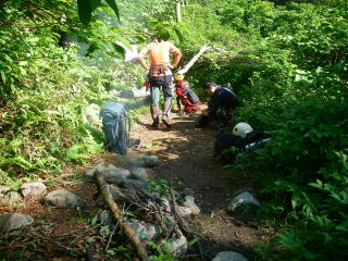 この高巻きは踏み跡がバラけてないせいか、しっかりしていてはかどる。覚悟を決めていたせいか、意外とあっさり45分で高巻き終了。アッサリとはいっても、水のない急斜面をひたすら登るので、さらに体力を消耗。沢に戻って水浴び。体が火照っているので冷やす。こーちゃんや高Pから薬を何種類かもらって飲んだのだが、どれかが効いて胃のむかつきはなくなった。