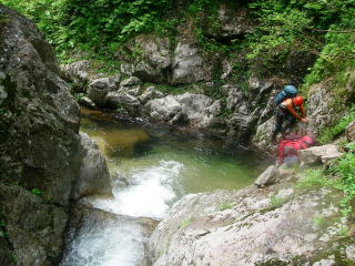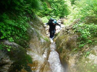最初のゴルジュは水流を進むが・・・ |