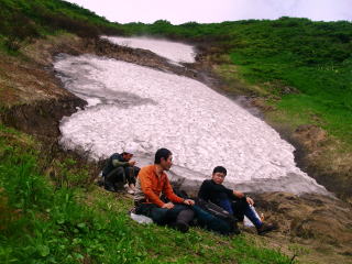 最後の赤布がぶら下がる二俣を右に少し進むと、源頭の雪渓が目に入った。間の丘を乗っこし、結局左俣に入る。雪渓の末端のこれからお花畑になる草原で、最後の水補給を兼ねた休憩。ちょっと曇り気味になってきてはいたが、とっても気持ちの良いところだった。ハクサンコザクラが少し咲いていた。ニッコウキスゲ、イワカガミなども。