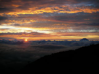 今日は白峰南嶺を越えて、北岳山荘まで行く予定。あわよくば、肩の小屋を視界に入れながら・・・。肩の小屋まで行っておくと、広河原をお昼頃発のバスに乗れるから。それを逃すと次は16時10分までない。というわけで、きのうと同様ポリシーに反して暗いうちからゴソゴソし始める。昨日で日の出が5時半だということがわかているので、それに合わせて準備。5時過ぎに明るくなって南峰を出発。北峰で御来光ということにした。北峰と南峰のコルでテントを張っている中高年の3人組がいた。なんでまた、こんなむさ苦しいところで・・・。