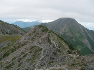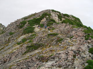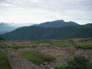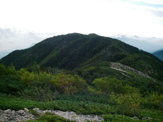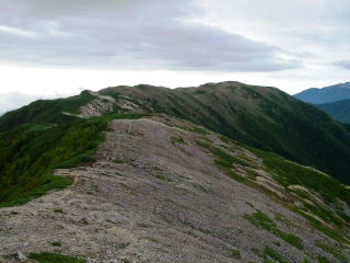 農鳥岳の登り。こんなにいーとこだったっけ・・・。二重山稜っぽい広い尾根。後は白峰南嶺がウネウネと連なってるし。消化試合気分は吹き飛んで、楽しく歩くことができた。日が差さないのだけが残念・・・。連休最終日だけあって、下ってくる人が圧倒的に多い。