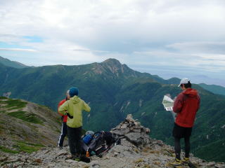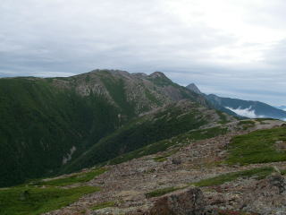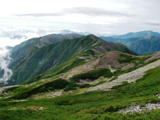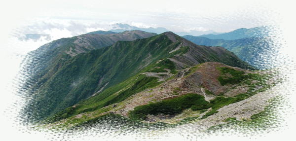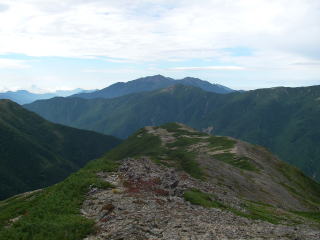 | 広河内岳から南に伸びる尾根と蝙蝠岳、荒川岳 |