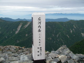 白河内岳から広河内岳の根本までは、アップダウンも小さくてあっという間。根本から広河内岳までは200m弱の登り。広河内岳までおじさん付いてきていた。山頂には6人。山頂で人がいたのは布引山以来。付いてきていたおじさんと、笹山のダイレクト尾根を登ってきた510さんお二人。伝付からの男の人。大門沢下降点からの若いにーちゃん。