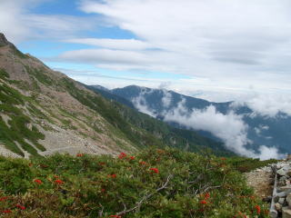 農鳥岳で休憩。西農鳥岳に向かうくらいで、気分が消化試合になってきた。白峰三山なんていったら第一級の縦走路。なのに気分が乗らないのは、パッとしない天気のせい?肩の小屋までの皮算用ばかりしていた。3000mの稜線はすでに草紅葉が進んでいる。こんだけずっと暑いのに、ちゃんとするんだなあ・・・と感じた。暑い寒いは関係なく、時期が来たら紅葉ってするもんなのか・・・?