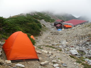 わざとゆっくりテントを張ったりするものの、時間はたたない。外はガスだし風は強いので、テントの中でヒマを潰すことになる。おかげで(?)明日の行動食にも手を付けてしまった。地図を眺めたりして過ごし、やっとこさ寝てもよい時間に。ところが寝れない・・・。暑い。昼より気温上がった?天気図見たら、日本海に小さい低気圧がポコっとある。こいつに向かって南風が吹いてるんだろうな・・・と予想できた。寝袋に入ると暑いので、チャック全開で寝た。・・が、ほとんど朝までウトウト程度だったように思う。やれやれ・・・。長い北岳山荘でした。