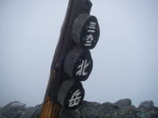 朝方は時々パラパラと雨も降ったが、動き出す頃にはガスと風だけに。テントの中から外を見ると、見るからに寒そう。でも、外に出ると寒くない。相当気温は高そうだ。稜線では風にあおられてヨタヨタしながら歩く。50分で4回目の北岳登頂。でも、何も見えず・・・。水だけ飲んで山頂を後にする。20分で肩の小屋へ。北岳山荘から1時間10分か・・・。だったら昨日肩の小屋まで来ておけばよかった。そうすれば、どう動いてもお昼のバスに乗れたのに・・・。失敗。