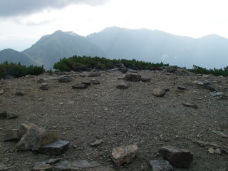 なんとなく良くなるような気配があったので、しばらく山頂で粘ってみることにする。どうせ早く降りても夕方のバスを待つ時間が長くなるだけ。山頂の一段下の広場は、明らかなテン場になっている。水はないけど。風は強く、山頂は辛いので、多少風がしのげるこのテン場で休んでいた。西からの風に乗って雲がやってきて、北岳のラインを越えると雲が消滅していった。なので鳳凰三山はずっと晴れていた。