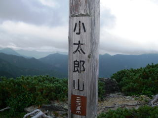 まあ、ずっとガスガスなので、小太郎山はまたの機会に・・・という気持ちになっていた。小屋から15分で小太郎山の分岐。ガスガスだったけど、ここでザックを降ろして作戦タイムを兼ねた休憩。すると、フーッとガスがなくなり、小太郎尾根が見渡せた。どうも、この2800mくらいの高さから上が雲の中に入っているようだ。まあ、行ってみるか。小太郎山がガスより下で、周りの山の2800m以下が見えてるなら。小太郎山に行く間に晴れるかもしれんし・・・。