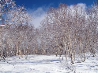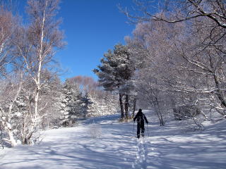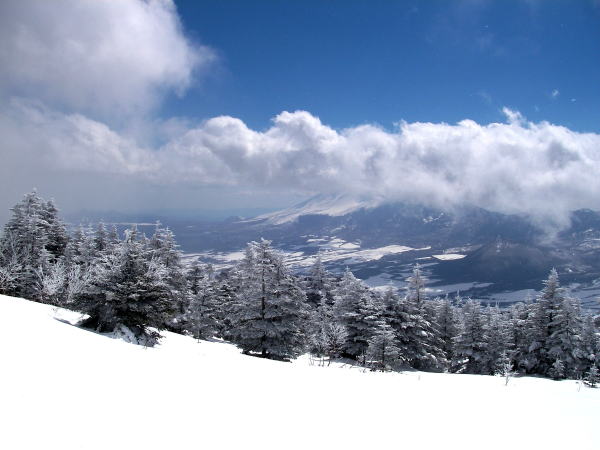 新雪はどのくらいだろう・・・10センチくらい?ほとんど晴れてるけど、寒気の名残なのか四阿山の山頂あたりは雲がある。回復傾向なので山頂に着くまでに晴れてくれるでしょう。未明まで雪だったはずなので、樹氷がきれいに付いている。これで北アルプスまで晴れてくれれば言うことなしだが、そこまでは期待しないでおこう。