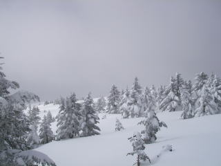 根子岳との分岐まで戻ると一気に雲がなくなった。雲のないとこまで来たのかと思いきや、山頂も晴れてきた。もう少し粘ってればよかったのかも・・・。まあ仕方ない。雪質は今までの四阿山ではダントツのパウダー!でも緩い。一番斜度のあるところは密林になってたりで、せいぜい3,4ターンくらいしかできない。登りのトレースを意識し過ぎると、これまた滑れなくなってしまう。