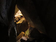 数あるアトラクションの中でも群を抜いていたのが胎内洞。岩の積み重なったところがトンネルになっていて、それをくぐって通過するようになっている。最初はただの穴かと思いきや、入ったら右に曲がって、左上に登り、さらに登ると出口が見える。入口に「ロープにそって通り抜けて下さい」の看板があった。ロープの通りに進むと出口に出ることができるのでした。