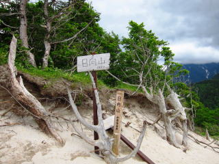 さすが甲斐駒の近所。花崗岩の奇岩があちこちに。ここは風化した花崗岩だけど、尾白川はツルンツルンに磨かれた花崗岩だった。砂の山頂は気持ちよさそうだったけど、北から強風が吹いてきて砂嵐のようになる。顔が痛い痛い。仕方ないので林の中に逃げ込む。