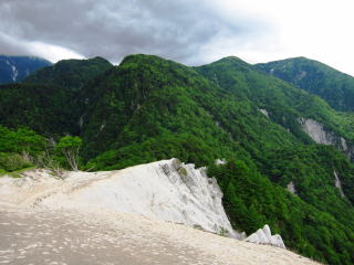 林の中も砂が飛んできたりでゆっくりしていられるような感じではなかったので、さっさと降りることにした。ピストンではなく、一応周回で錦滝を経由する。ザレの道を小さなコルまで降りるのだが、ここらへんの景色が面白かった。今日はここらへんだけ太陽が出てきて、砂の白がまぶしいくらいだった。