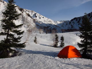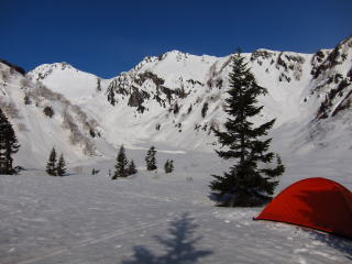 メシを作っているとカシャカシャと音がしたので玄関開けると、すでにエスパースの人が出発。雪はまだ堅そうだ。しかし、登る斜面はギラギラに日を浴びているので、そのうち緩むことでしょう。それにしても、ここはいいとこだなあ・・・。もう少しアプローチの内蔵助谷が安定してれば、もっともっと人が入るんでしょうね・・・。きっと。