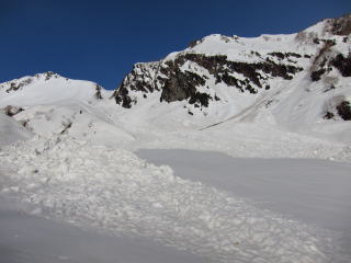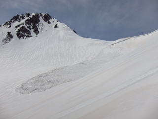 テントのアンカーを打ちなおす。今日もスコップとピッケルで。なんのために持ってきたのか・・・。6時40分に出発。だいぶ雪は緩んできた。谷が狭まる前までデブリが押し出してきている。こんな緩いところまで押し出してくるってことは、相当な押しの強さがあったんでしょうな。中間あたりでも境目がしっかりしているので、スローモーションで流れた雪崩と思われます。