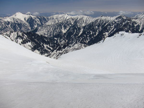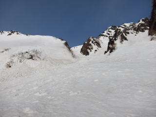 さあ、名物バーンを滑ります。雪が良いので滑りやすく、斜度はきついけどテレマークは可能。ただ、一生懸命滑らないといけない。気持ち良く滑るにはボクにとってちょっと急ですな。登る時から気になっていた右のコル。その先は御前谷の領域。分ける尾根に乗ってみたかった。