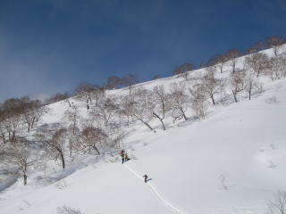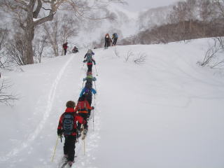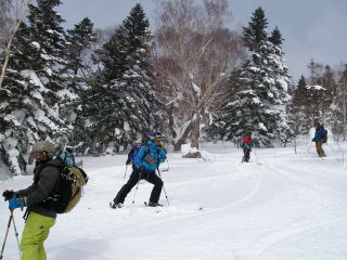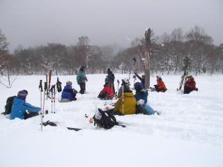 中腹になるにつれて雪質が安定してくる。雪も軽くなってくるけど、斜度も緩くなってくるので板が走らない。それでもブナ林を流すのはとても気持ちが良い。11人いるので迷子者が出ないように、短めにピッチを切って滑る。そして点呼。スキー場に戻る直前にあった雪原で中休止。少しマッタリしてからゲレンデに戻った。