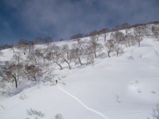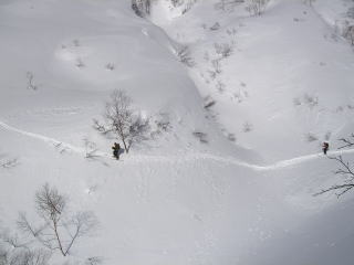 今日は滑り出しから笹ヶ峰や池ノ峰の尾根が見えない。一度前科があるだけに、最初の滑り出しの方向だけは間違えるわけにはいかない。とくにこの大人数だし。上部はやっぱり風の影響が大きくて、堅くなったり柔らかくなったり。気の抜けない雪。全体的には片栗粉系の密度の高い雪で、やや抵抗がある雪だった。
