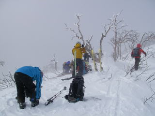 まずまずだった天気だが、あまり青空が出なくなってきた。登ってきたからなのか、天気自体が悪くなってきたからなのか・・・?まあ、出だしで少し晴れてくれたから、今日はヨシとしましょう。予報が予報だったのでね。稜線に着くけど、やっぱり風が強くて長居はできないので、準備だけしてさっさと滑ることに。