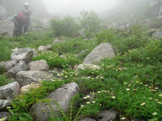 右俣は谷の切れ込みが浅いため、谷というよりも斜面と言ったほうがいい感じ。その斜面にお花畑が発達していました。花とは無縁の常念岳と勝手なイメージを持っていましたが、こんなところに結構大規模なお花畑があるとは・・・ビックリ!チングルマが盛りだったのが大きいかな。これで晴れていたら素晴らしいロケーションだったに違いない。詰めはかなりの傾斜で詰め上げていたので、晴れていたらかなりの高度感だったに違いない。せめて最後に前常念から二ノ沢を見おろしたかったけど、今日は一日中ガスで叶わず・・・。