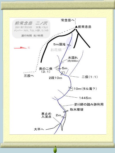 二ノ沢は入渓点の林道からの標高差は1400m。普通の登山でも大きな標高差の部類に入る。沢登りでこれだけの標高差をかけ上がれたのは、単に何も出てこなかったから。