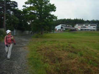 こんな天気にもかかわらず、あだたら高原スキー場の駐車場はそこそこの車。悪天の中登っている人もいるだろうけど、天気待ちで待機している人もたくさんいそうだ。7時ごろになって雨がやんだ。相変わらずガスガスではあるが、天気はなんとなく落ち着いたような雰囲気。待機中のみなさんが一斉に車から出てきて出発準備。ガスガスで気分は盛り上がらないが、我が家もダメモトで登ることにした。 もう少し待てばゴンドラが動き出す時間だが、まあここは下から登ることにする。くろがね小屋に向かう馬車道を分け、ゲレンデの中に付けられた登山道を歩くが面白くない。急坂だったのが平らになると五葉松平。そして、さらにダラダラと歩くと薬師岳の標識が立つ広場へ。ここでゴンドラから道が合流する。以前としてガスガスで展望ナシ。